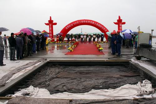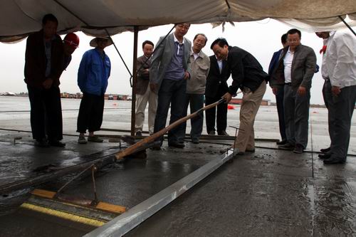 由公司承建的金昌機(jī)場停機(jī)坪工程按4C標(biāo)準(zhǔn)設(shè)計(jì),站坪機(jī)位4個(2B2C),總面積2.65萬平方米,可供波音737和空客320等機(jī)型的起降。該項(xiàng)工程自2009年10月進(jìn)場,公司金昌機(jī)場項(xiàng)目部全體人員在高溫酷暑、大風(fēng)揚(yáng)沙等惡劣氣候條件下,克服種種困難,通過改進(jìn)施工工藝、調(diào)整作業(yè)時(shí)間等措施,順利完成了基礎(chǔ)施工。項(xiàng)目部僅用了25個晝夜就完成停機(jī)坪2.65萬平方米混凝土道面工程施工。